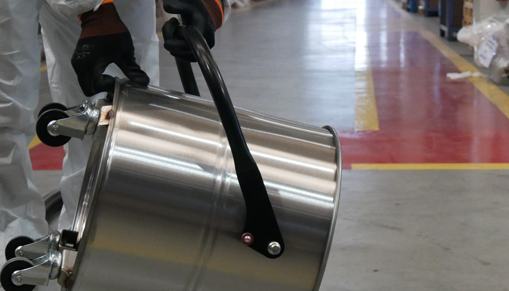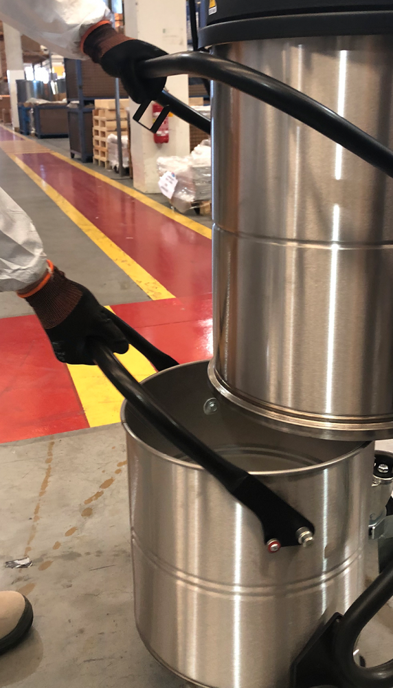 El material recogido se almacena en un contenedor de acero inoxidable AISI 304, que cuenta con un asa metálica que permite separarlo de la máquina. Esta consideración de diseño tiene por objeto evitar la aparición de chispas resultantes de la carga electrostática. Además, el contenedor está equipado con cuatro robustas ruedas pivotantes que permiten desplazarlo sin esfuerzo para eliminar el material recogido.