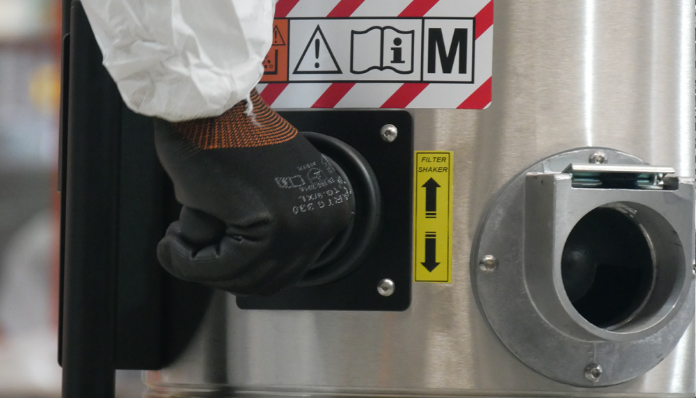 Situado en un lateral de la cámara del filtro, un agitador manual ergonómico proporciona un medio cómodo para que el operario limpie el filtro de forma rápida y eficaz. Utilizando este sistema de limpieza inteligente, el operador puede eliminar fácilmente el polvo y los residuos de la superficie del filtro, garantizando una funcionalidad continua sin necesidad de sustituir o lavar el filtro. Esto permite al operario trabajar de forma ininterrumpida.