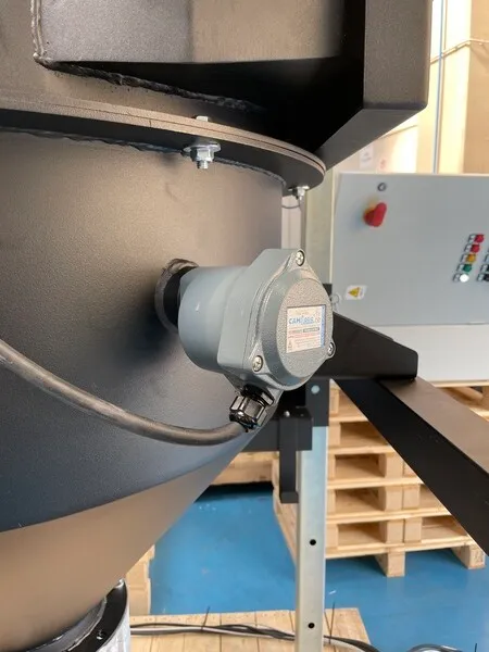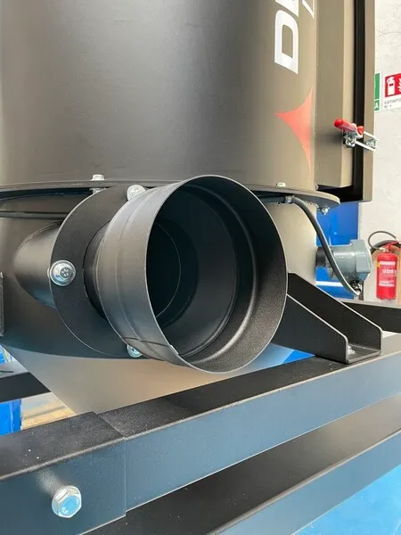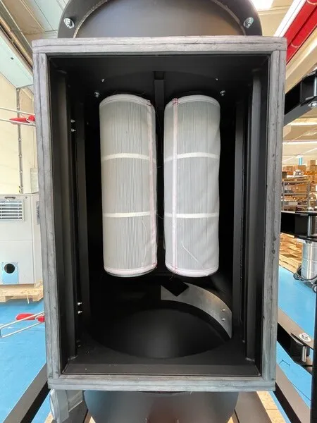 La unidad de filtrado está compuesta por 4 cartuchos de poliéster aluminizado que se limpian mediante un sistema automático de limpieza del filtro por chorro pulsante.