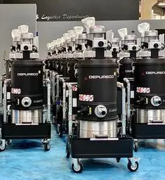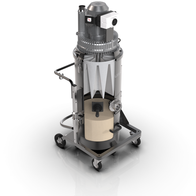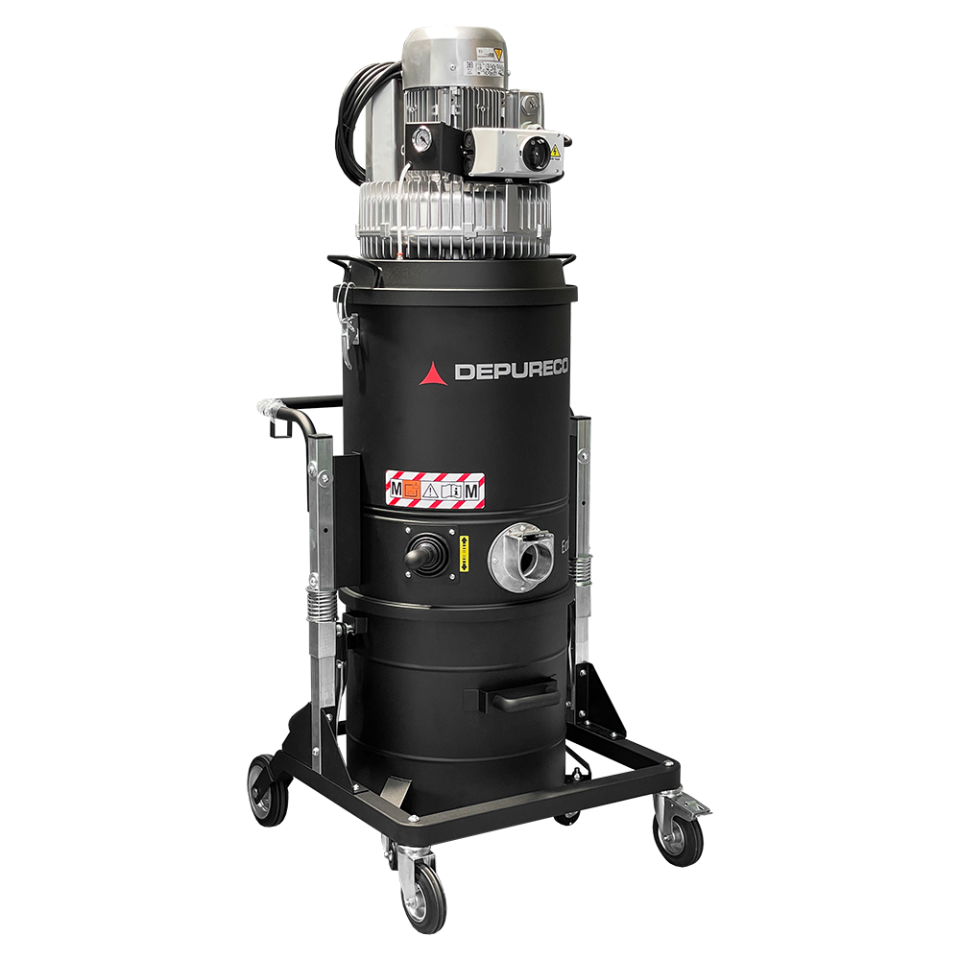 La aspiradora industrial Ecobull M destaca como la opción más potente de su categoría. Incorpora una turbina de canal lateral de 2,2 CV, lo que la hace ideal para un funcionamiento continuo sin necesidad de mantenimiento frecuente. Su cámara filtrante cuenta con un filtro de poliéster de generosas dimensiones y una superficie de 3720,01 pulg2. Este filtro está certificado como Clase M, lo que garantiza una eficacia de filtración de 1 micra, perfecta para tratar incluso las partículas de polvo más finas. La gama de aspiradoras industriales trifásicas Depureco ofrece la flexibilidad de instalar diferentes filtros en función de la aplicación profesional específica. Otras opciones de filtrado incluyen filtros de teflón repelentes al agua, filtros de Nomex resistentes a temperaturas de hasta 482 °F y filtros tratados con PTFE para los tipos de polvo más difíciles y adhesivos. A petición, la unidad también puede equiparse con un filtro absoluto H14. La practicidad se ve reforzada por el gran contenedor desmontable del aspirador industrial Ecobull, disponible en tamaños de 26 galones, equipado con ruedas para facilitar la eliminación del material. Para mayor comodidad, pueden utilizarse bolsas de recogida desechables. Para garantizar la seguridad durante la aspiración de líquidos, se puede integrar un sistema flotante en el contenedor.