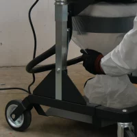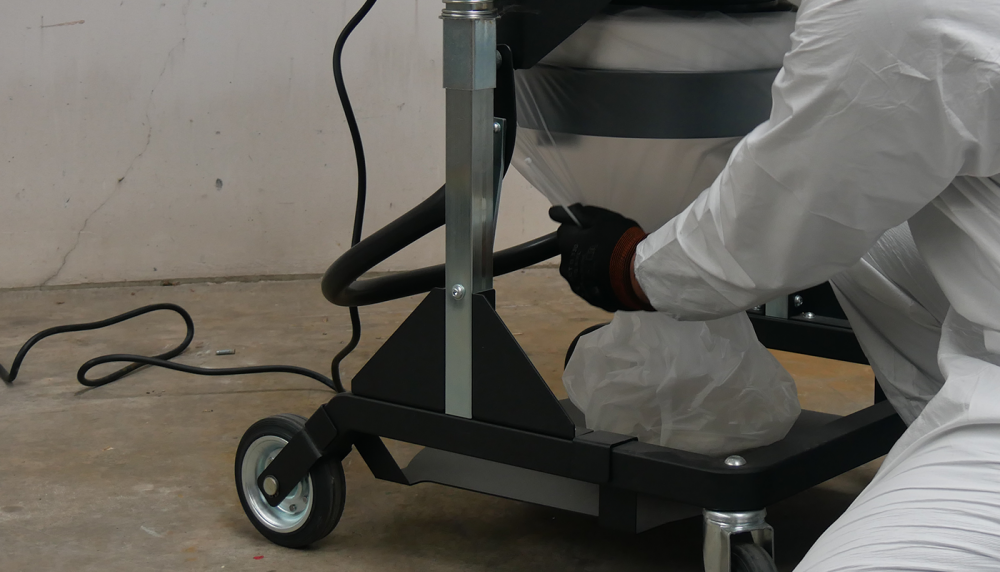 El material recogido se almacena de forma segura dentro de una bolsa de plástico resistente conocida como Longopac®. Esta bolsa, con una longitud de 787,402 pulgadas, se enrolla cómodamente en la base de la cámara de filtrado. Cuando se apaga la aspiradora, el material recogido desciende sin esfuerzo a la bolsa. Una vez que la bolsa alcanza su capacidad, el operario puede sellarla fácilmente, cortarla y almacenar de forma segura el polvo acumulado. Este proceso permite una transición fluida a una bolsa nueva sin ningún contacto directo entre el operador y el material recogido.