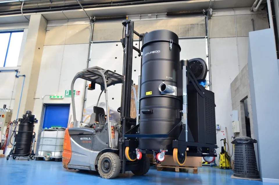 Depureco ofrece la serie Puma como parte de su gama de aspiradoras industriales trifásicas de potencia media-grande. Estas aspiradoras cuentan con sopladores de canal lateral de doble etapa de alta calidad fabricados en Italia, que garantizan un caudal máximo de 1500 CFM para un flujo de aire excepcional. La válvula de seguridad rompevacío es una característica estándar. Con un diseño de aspiración tangencial y un robusto ciclón soldado en el interior de la cámara del filtro, las aspiradoras Puma garantizan una excelente eficacia, incluso con las partículas de polvo más finas. Este diseño protege el filtro de los materiales aspirados reduciendo la velocidad y dirigiendo el material hacia el contenedor mediante la fricción generada por el ciclón.