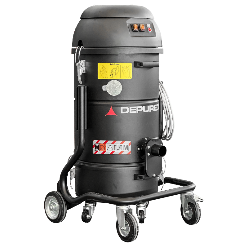 En particular, esta aspiradora industrial, que forma parte de la gama monofásica de Depureco, incorpora el innovador sistema de limpieza de filtros JetClean®. Este sistema permite limpiar el filtro sin esfuerzo y sin necesidad de que el operario apague la aspiradora. Además, la aspiradora está equipada con un contenedor desmontable de 20 litros en la parte inferior, lo que facilita la eliminación fácil y segura del material recogido.