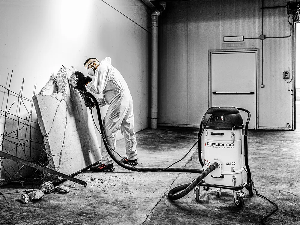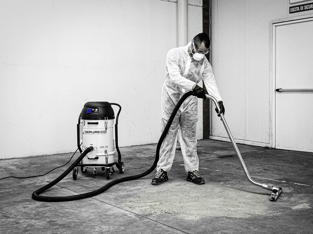 El XM 20 Jet Clean® de Depureco es la aspiradora industrial más pequeña diseñada específicamente para capturar partículas finas de polvo. Utiliza dos motores con un sistema de refrigeración By-Pass (HECHO EN ITALIA) para ofrecer un rendimiento de aspiración excepcionalmente potente. El polvo y los residuos se aspiran a través de una robusta entrada metálica que admite una manguera flexible de 1,57 pulg. o 1,96 pulg. En el interior de la aspiradora hay un cartucho filtrante certificado, aprobado por el BIA (Berufsgenossenschaftliches Institut für Arbeitssicherheit), perteneciente a la clase M y que ofrece una eficacia de filtración de 1µ. Con una superficie filtrante de 5,500 in² , captura eficazmente grandes volúmenes de polvo sin obstruir el filtro.