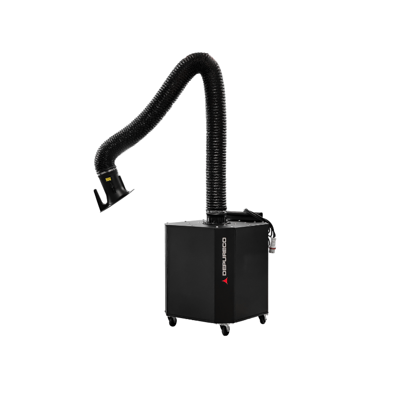 AIR WELD is a portable welding fume extractor built for source capture in welding and fabrication environments. Its 3-meter articulated arm lets the operator position the hood where fumes are generated, while adjustable airflow and a large 18,576 in² filter surface help support cleaner air in the work zone.
