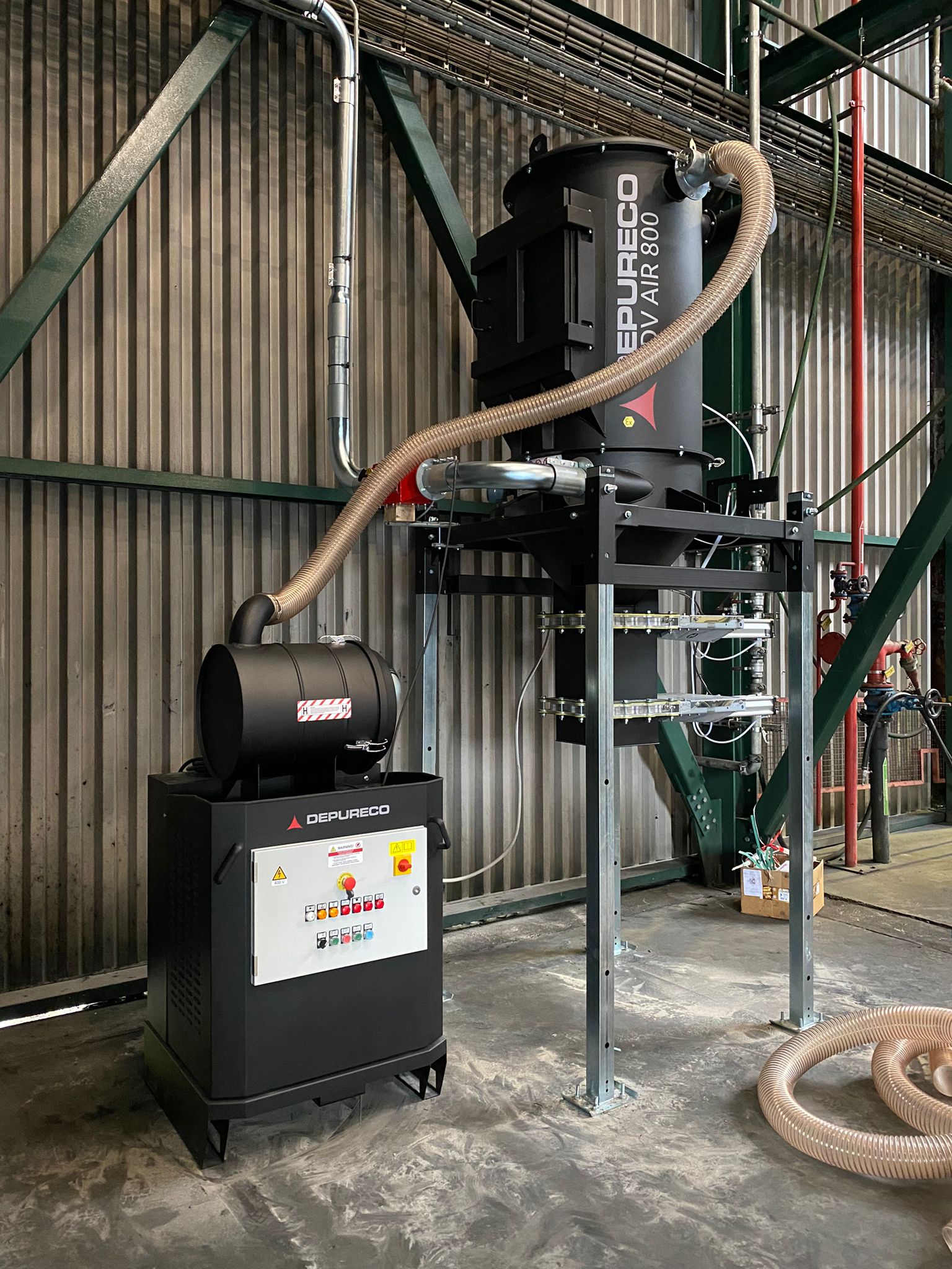 The DV-AIR 800 is a filtration unit designed for centralized vacuum systems, enabling efficient cleaning of production lines, floors, and equipment both during and after the manufacturing process, as well as in continuous operation. These centralized systems allow multiple operators to work simultaneously across different areas of a facility, efficiently transporting large volumes of material over long distances. In industries such as cereal processing, they help remove bulk materials from machinery, preventing downtime and ensuring smooth operations. With its adaptable design and advanced dry filtration system—available with cartridges or sleeves—the DV-AIR 800 effectively captures solid particles, even in high-temperature and high-humidity environments. This ensures cleaner production lines, improved air quality, and enhanced worker safety.