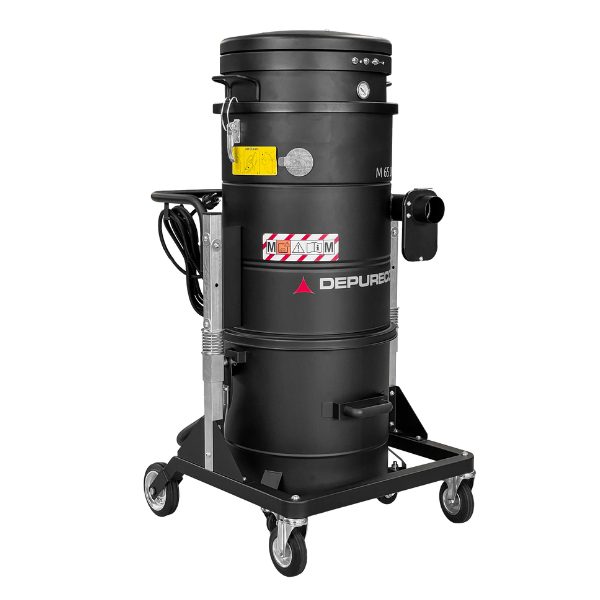 The M100 Jet Clean® belongs to Depureco’s single-phase series of industrial vacuum cleaners and stands out as the most powerful cyclone model. With its 3 By-Pass motors, it achieves an impressive power output of 3.3 HP. This industrial vacuum cleaner, the M100 Jet Clean®, is designed to handle various types of materials, including dust, chips, liquids, and challenging substances, with the flexibility to use hoses extending over several meters.