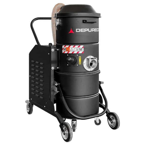 The TB UP is a compact industrial vacuum that comes with a side-channel turbine located at the rear, enclosed in a sturdy metal casing. It comes with a standard vacuum breaker safety valve installed in the turbine. The filter chamber houses a spacious polyester filter with M Class certification, ensuring an efficient filtration of even the finest dust particles. Depending on the specific professional application, alternative filters can be installed in this particular model from the Depureco three-phase range. Options include Teflon water-repellent filters, Nomex filters resistant to temperatures up to 482°F, and filters treated with PTFE for enhanced binding of challenging dust. Additionally, an H14 absolute filter can be added upon request. The TB UP industrial vacuum is equipped with a sizable 12 detachable container that is conveniently mounted on wheels, making it easy for the operator to empty the collected material. Disposable collection bags can also be used for added convenience. Furthermore, a floating system can be incorporated into the container to safely vacuum liquids.