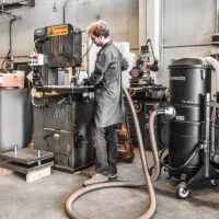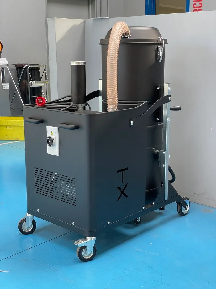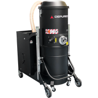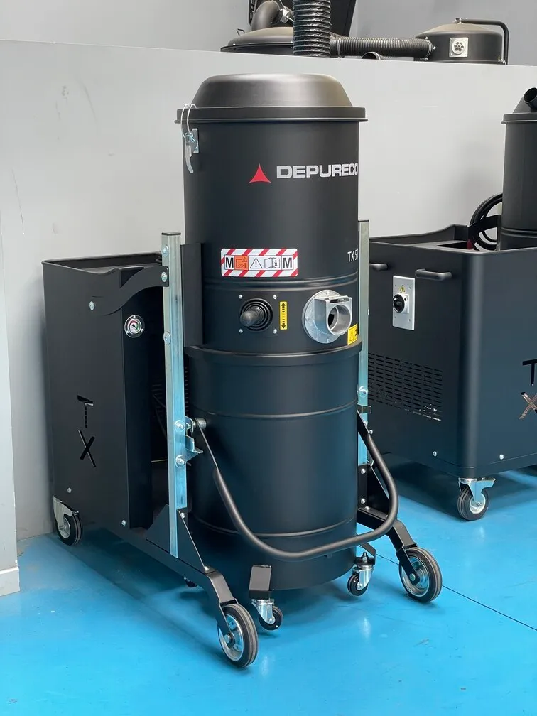 The TX industrial vacuum distinguishes itself with its impressive power, maneuverability, and compact design. It is equipped with a powerful side channel turbine, which ensures continuous operation without the need for frequent maintenance. The filter chamber houses a generously sized polyester filter with a large surface area. This filter is certified as M Class, guaranteeing efficient filtration with a 1-micron filtration efficiency, even for the finest dust particles. Depending on the specific professional application, alternative filters can be installed in this industrial vacuum from the Depureco three-phase range. Options include Teflon water-repellent filters, Nomex filters that can withstand temperatures up to 482°F, and filters treated with PTFE for improved binding of challenging dust. On-demand, the unit can be fitted with an H14 absolute filter. The TX industrial vacuum is equipped with a sizable 26 gal detachable container, mounted on wheels for easy mobility and effortless emptying of the collected material. collection bags can also be used for added convenience. Additionally, a floating system can be incorporated into the container to enable safe vacuuming of liquids.