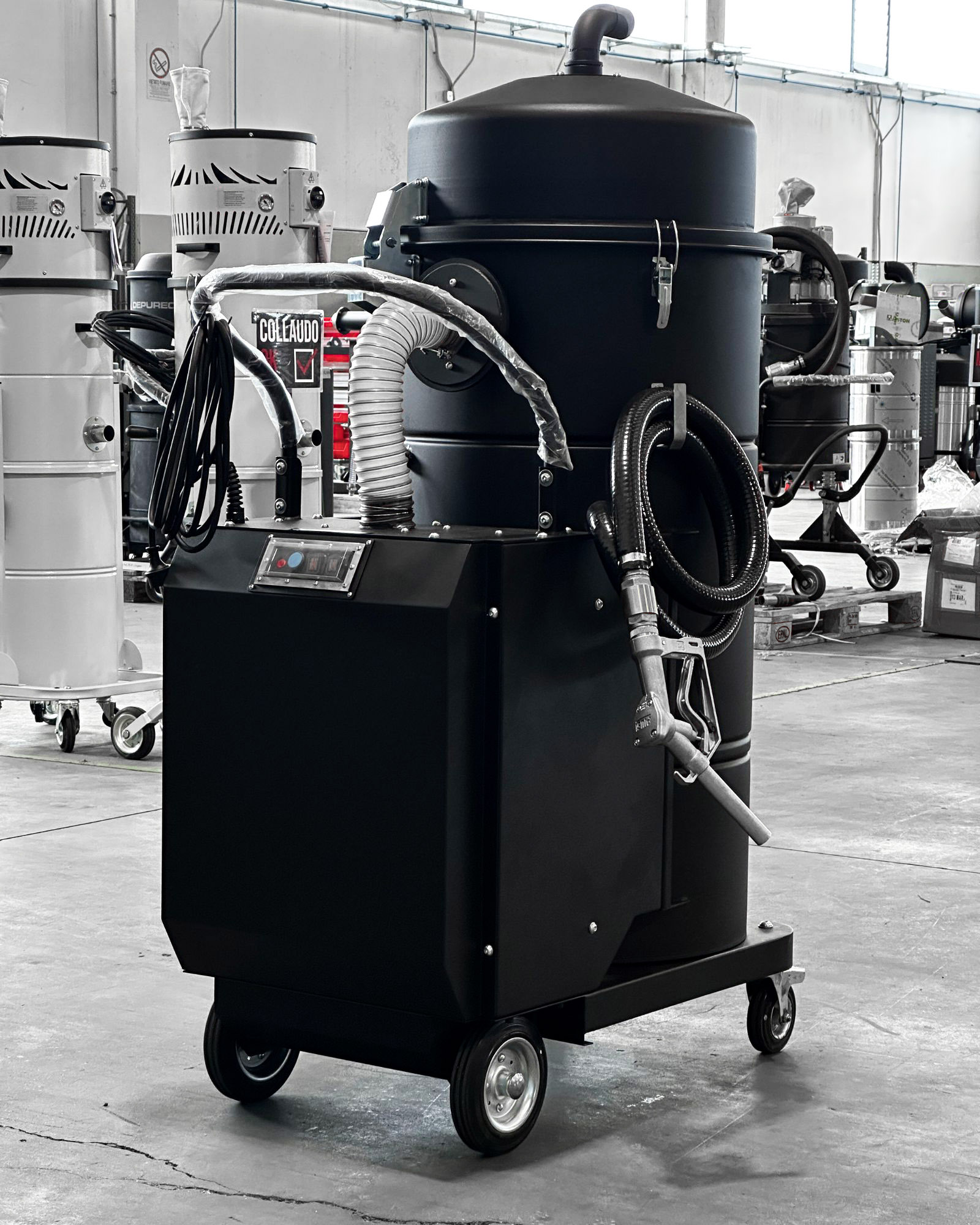 Suction comes from three by-pass motors managed by a single master switch with sequential start-up to reduce inrush current. The motors sit inside a reinforced housing lined with sound-dampening foam to keep noise low.